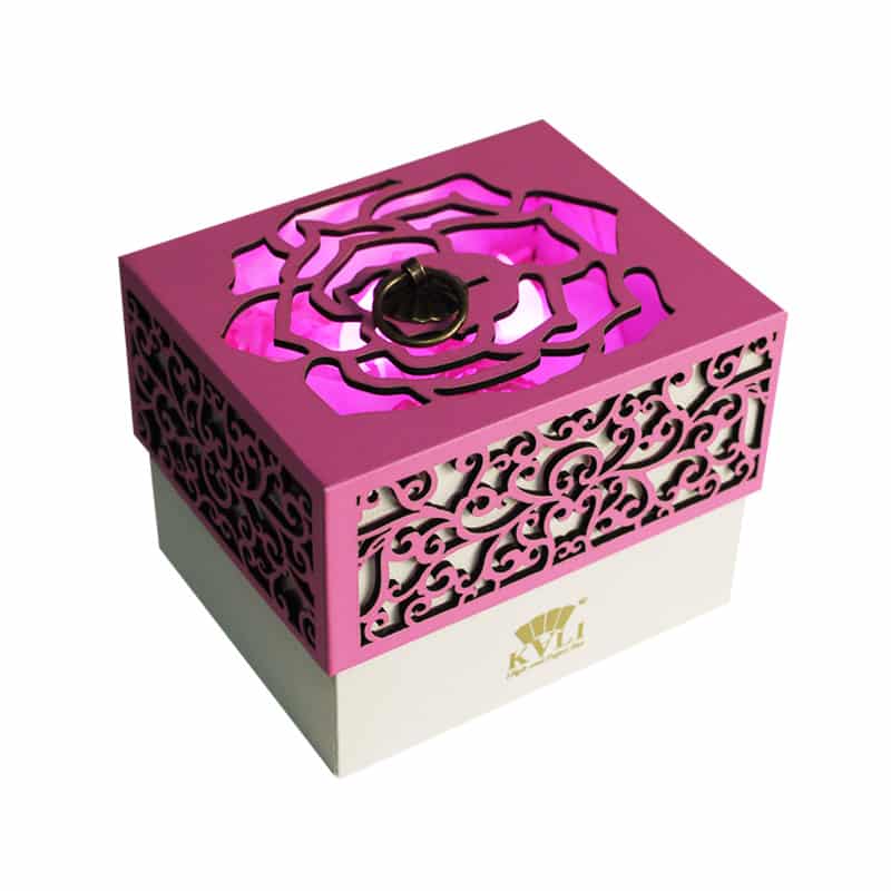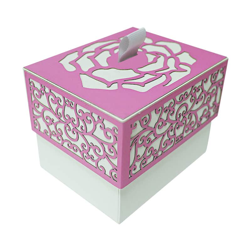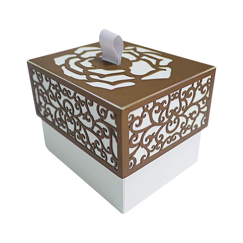 This cardboard laser-cut favor box with a lid features a rose-shaped laser hollow design on top, a flip-top structure and a transparent window.The packaging design incorporates paper cutting, a famous traditional Chinese art form. Various hollow patterns can be customized to meet different needs, highlighting an elegant, high-end aesthetic with strong artistic appeal.It serves not only as a gift box but also as an exquisite decorative ornament.