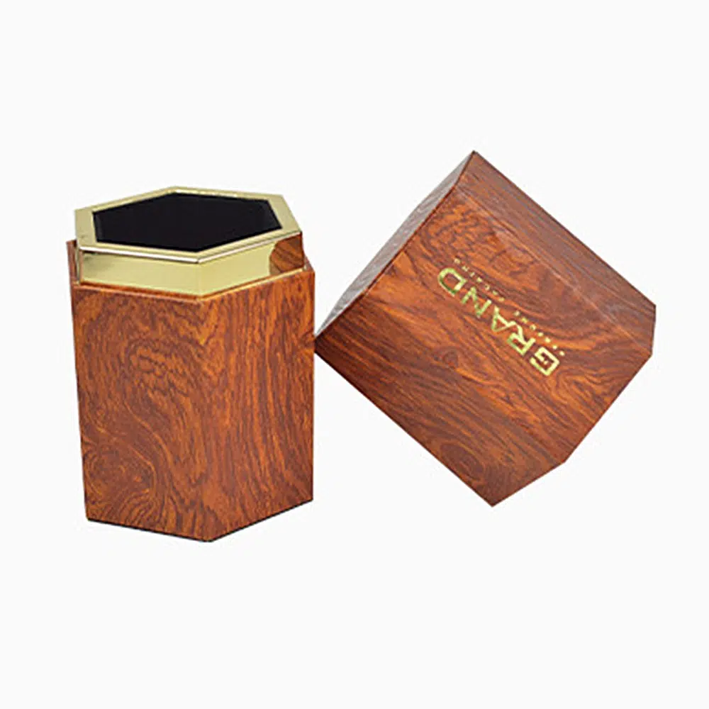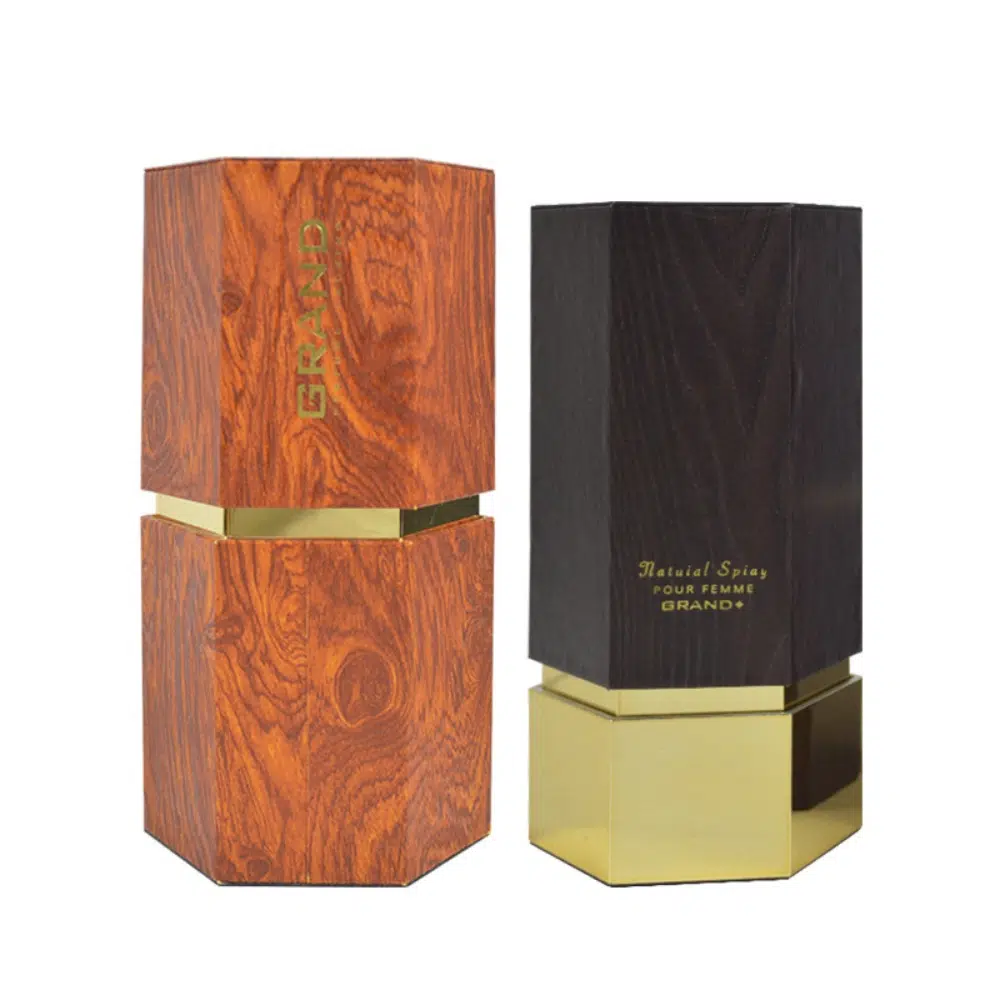 High-end MDF cosmetic and fragrance gift box features a unique hexagonal geometric shape with exquisite and high-grade wood grain texture, available in two tones: natural walnut and dark ebony. With precisely cut edges and corners, complemented by golden brass trim accents, the box presents an elegant and neat style. The interior is fully lined with soft flocked velvet and equipped with custom shockproof foam inserts, which not only ensures stable placement and enhances display effect, but also neatly stores high-end lipsticks, fragrances and other cosmetic and fragrance products, combining beauty and practicality.