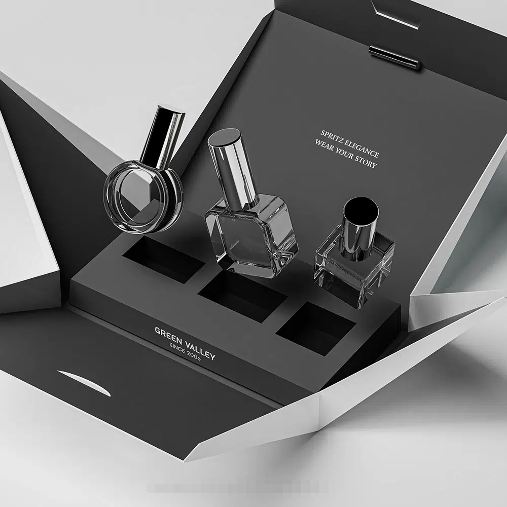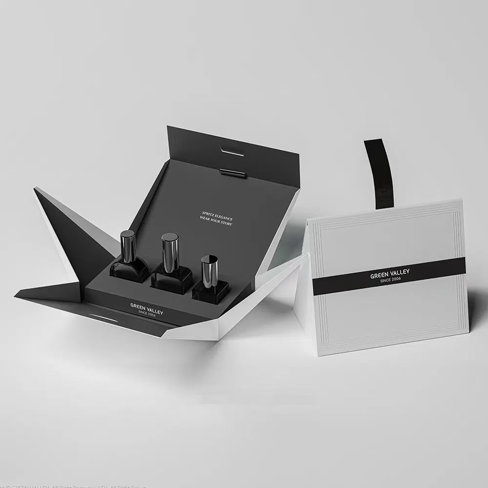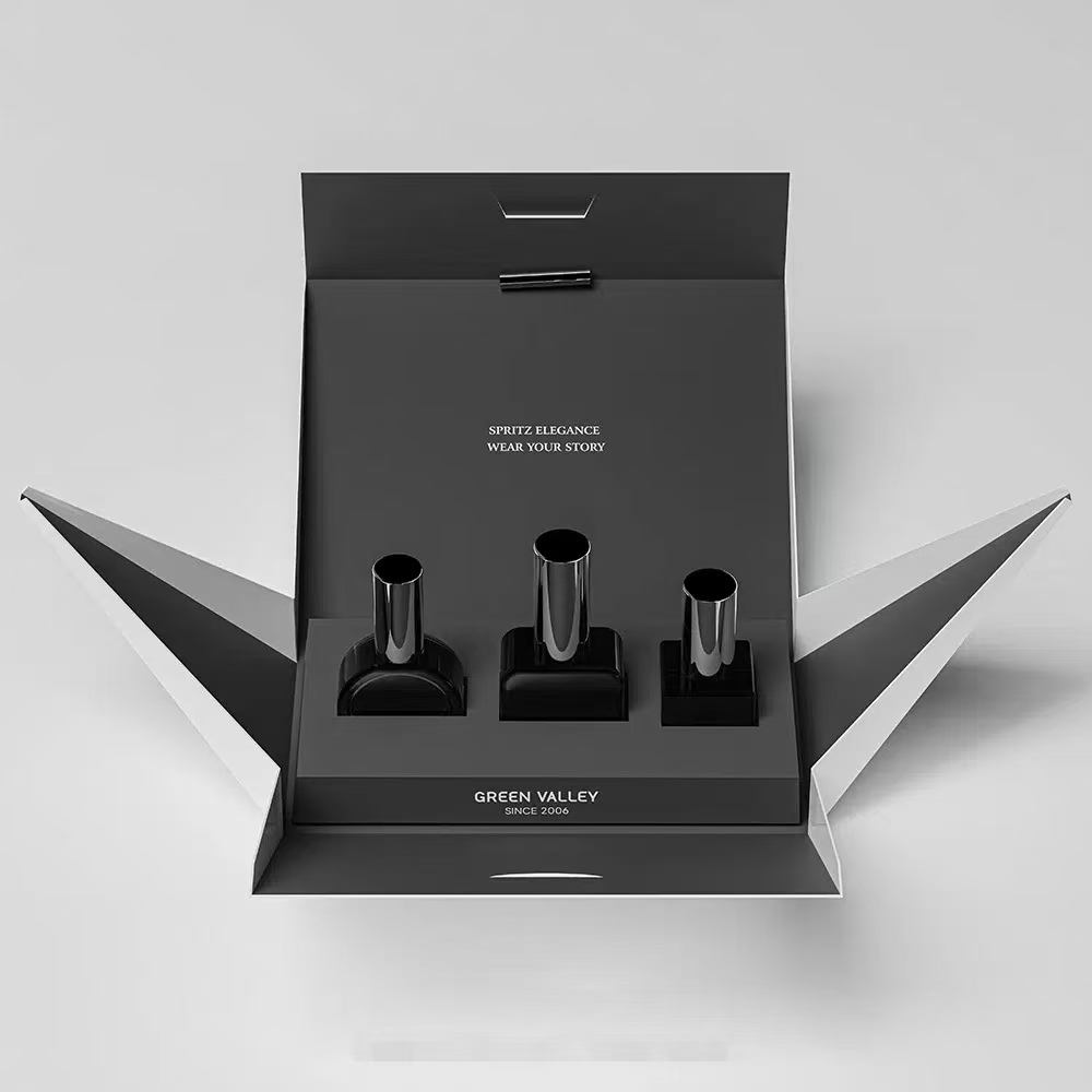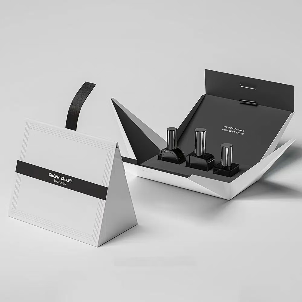Centered on symmetrical aesthetics, this perfume packaging box features dual triangular flaps that extend symmetrically. When opened, it forms a sleek and exquisite display platform, accentuating the perfume’s elegant charm. Both the outer sleeve and inner base are embellished with silver foil accents, which reflect premium metallic luster from multiple angles, enhancing the sense of refinement and layering, elevating the product’s high-end texture, and integrating ornamental and practical functions.